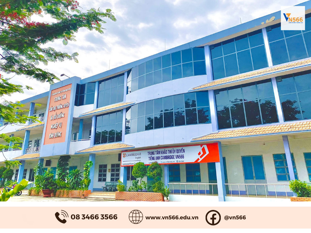 Trung tâm VN566 được thành lập bởi Sở Giáo dục và Đào tạo (GDĐT) Bình Dương, Trung tâm Giáo dục thường xuyên và Bồi Dưỡng Nghiệp vụ (TTGDTX&BDNV), và Hội đồng Khảo thí tiếng Anh Cambridge. Văn phòng chính của chúng tôi nằm tại TTGDTX&BDNV tỉnh Bình Dương, số 495, đường 30/4, phường Phú Thọ, Tp. Thủ Dầu Một