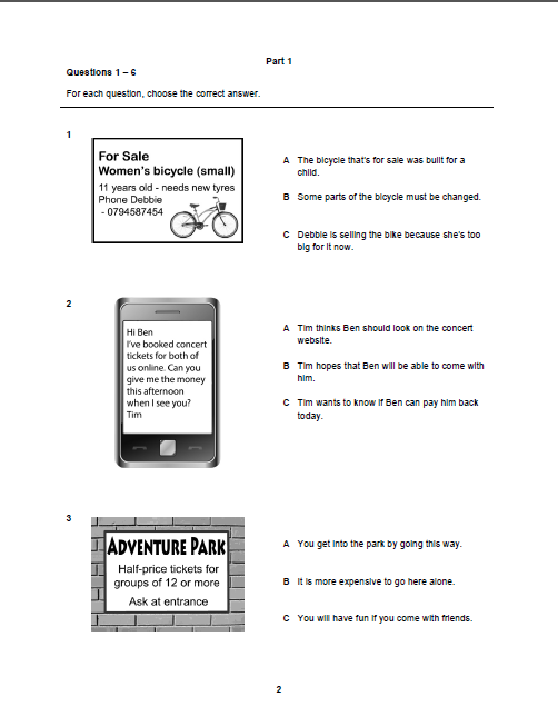 - Đọc và Viết (60 phút, chiếm 50% tổng điểm): đánh giá được năng lực đọc, hiểu các ký hiệu, thông tin quảng cáo, tạp chí. Để có thể hiểu những thông điệp trong các đoạn văn bản, thí sinh cần nắm được những cấu trúc câu và từ ngữ thông dụng.