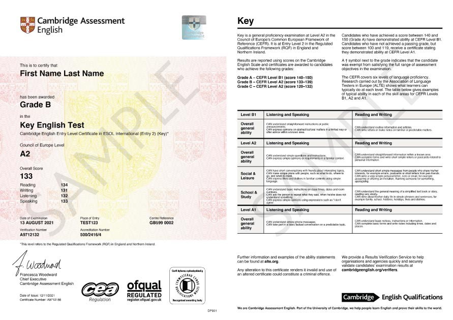 A2 Key hay Cambridge English Key English Test (KET) tương đương với cấp độ A2 trên Khung tham chiếu ngôn ngữ chung Châu Âu (CEFR). Đây là bài thi tiếng Anh được thiết kế bởi Hội đồng Khảo thí Cambridge Assessment English nhằm đánh giá chính xác khả năng hiểu và giao tiếp bằng tiếng Anh trong những tình huống cơ bản hằng ngày của thí sinh.